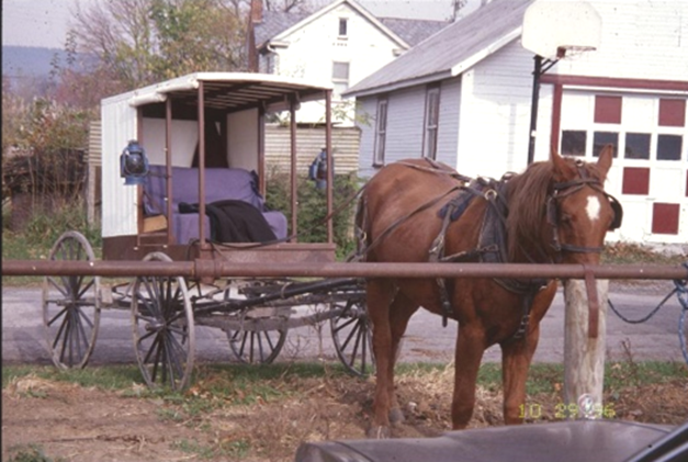 We drive into the barnyard on a bitter cold day to find some snow on the ground and many white buggies parked near Melinda’s farmhouse. The smell of tobacco drifts over from where some older men stand near the barn rolling cigarettes and smoking. They all wear black hats, long-sleeved pullover shirts and brown pants and coats. Lacking suspender or belt, the pants are snugged with lacing in the back. We walk into the house to see a wooden coffin resting in the middle of the living room on two saw horses. I remove my hat. The Amish are a closed society, but sometimes a funeral draws many English (non-Amish) people. In this case, Shirley and I are the only outsiders.